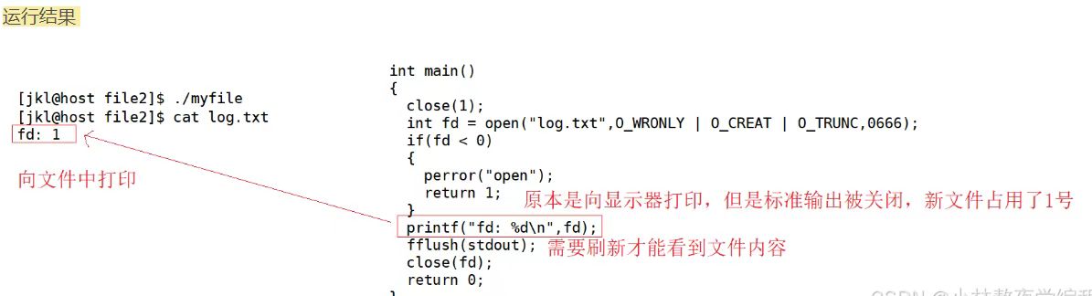 通过结果可以看出来,我们向显示器上面打印的数据没有被打印出来,不加close可以打印出来,正因为对于1号显示器文件采用的是行刷新,如果没有加\n,都会被存储到语言层的缓冲区,当进程结束要刷新到内核级的缓冲区的时候,发现已经把1号文件关闭了,就刷新不了了,也就不会被打印出来,要打印出来,要么在后面加上\n,要么不关闭1号文件描述符,进程结束刷新到内核级缓冲区。