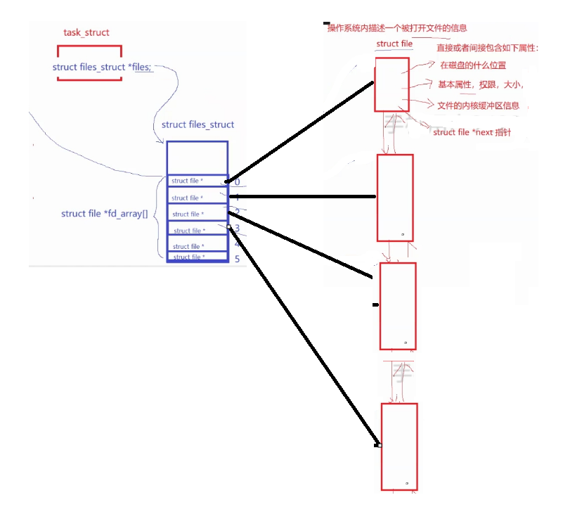struct files_struct:包含一个数组,里面存放文件描述符,每一个进程都拥有一份。