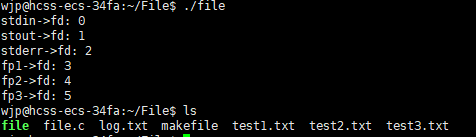 可以发现我们创建的3个文件的描述符是3,4,5 stdin,stdout,stderr的文件描述符是0,1,2。说明C语言会自动给我们打开这3个输入输出流。