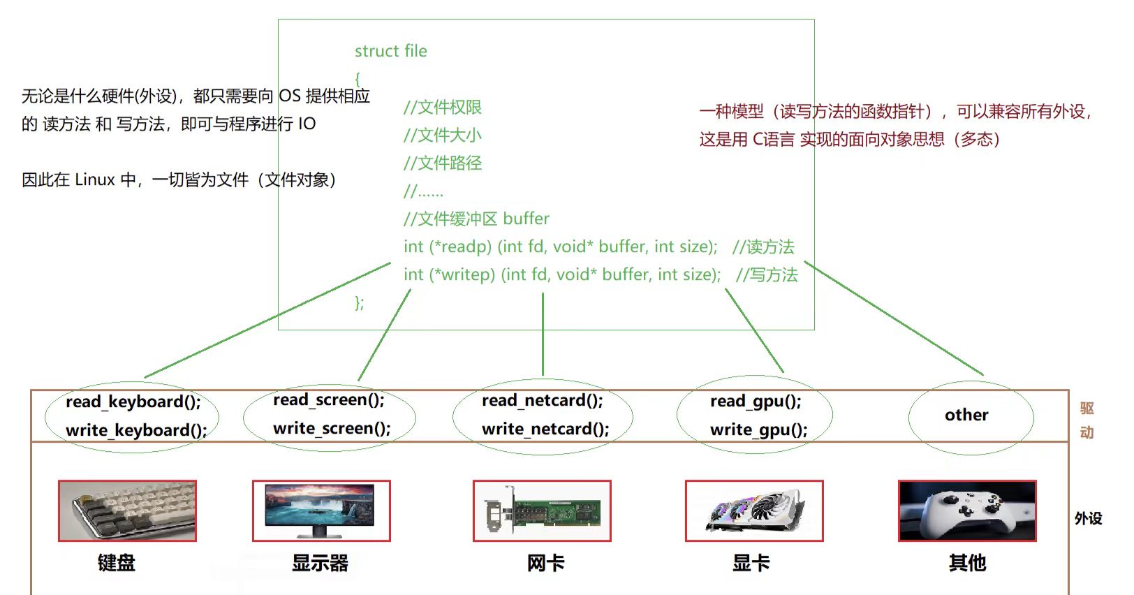 原理:无论是硬件(外设),还是软件(文件),对于 OS 来说,只需要提供相应的 读方法 和 写方法 就可以对其进行驱动,打开文件流后,将 file* 存入 fd_array 中管理即可,操作系统分配一个文件描述符给你,就可以通过文件描述符找到你并且去使用你了,因此在 Linux 中,一切皆文件