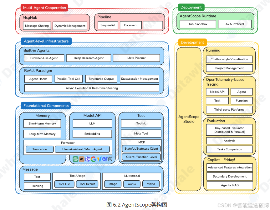 与AutoGen相比,AgentScope的核心差异在于其消息驱动的架构设计和工业级的工程实践。如果说AutoGen更像是一个灵活的"对话工作室",那么AgentScope就是一个完整的"智能体操作系统",为开发者提供了从开发、测试到部署的全生命周期支持。与许多框架采用的继承式设计不同,AgentScope选择了组合式架构和消息驱动模式。这种设计不仅增强了系统的模块化程度,也为其出色的并发性能和分布式能力奠定了基础。