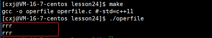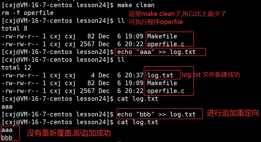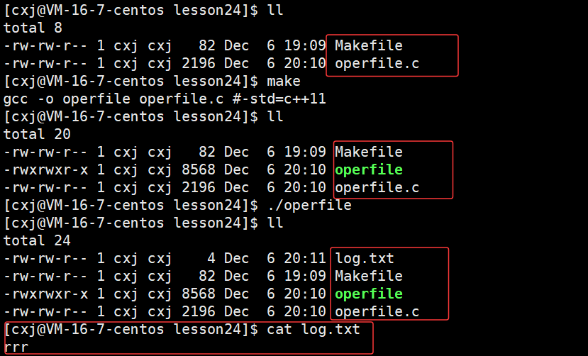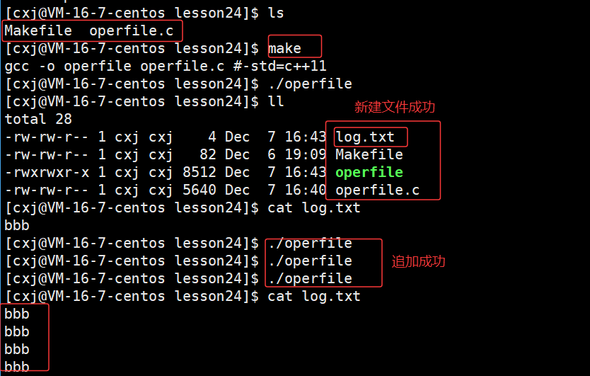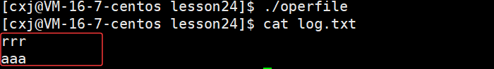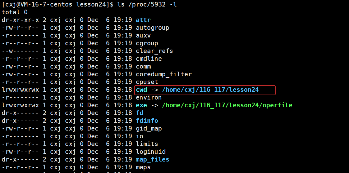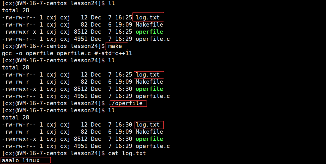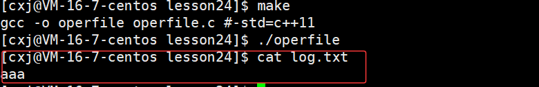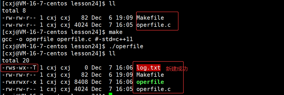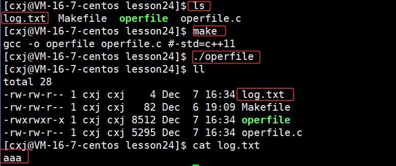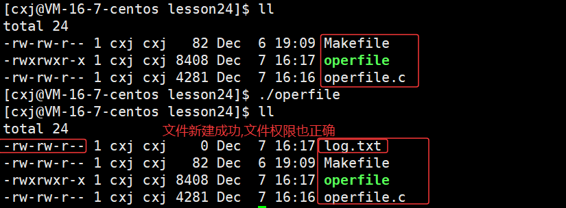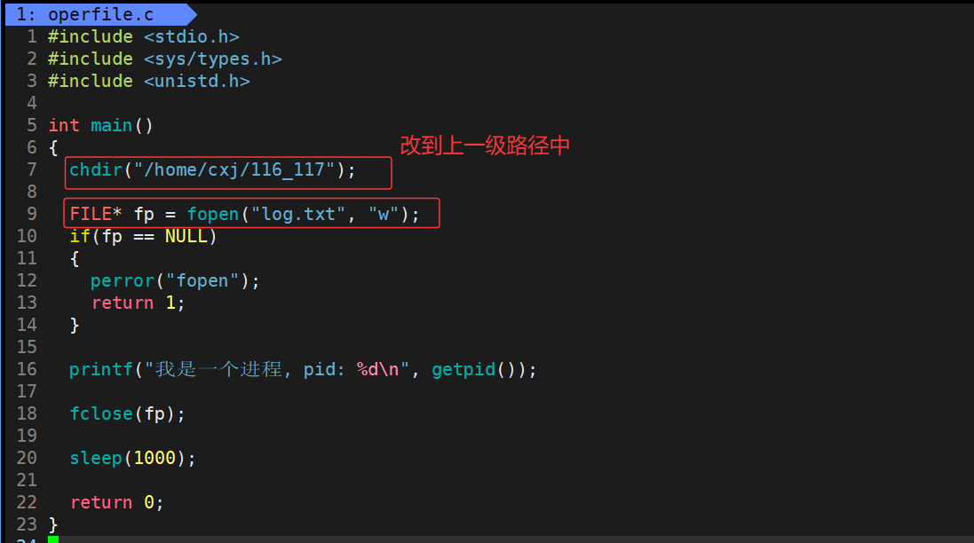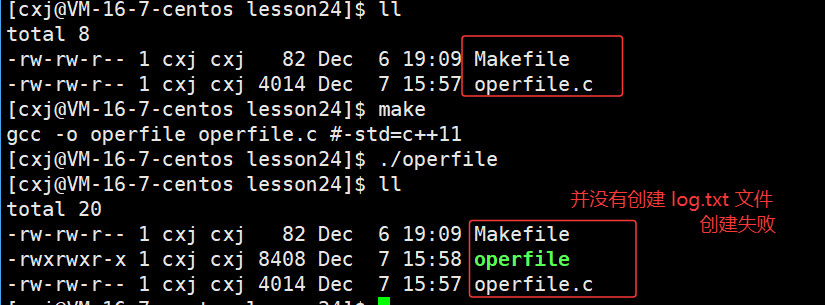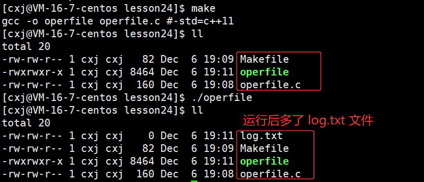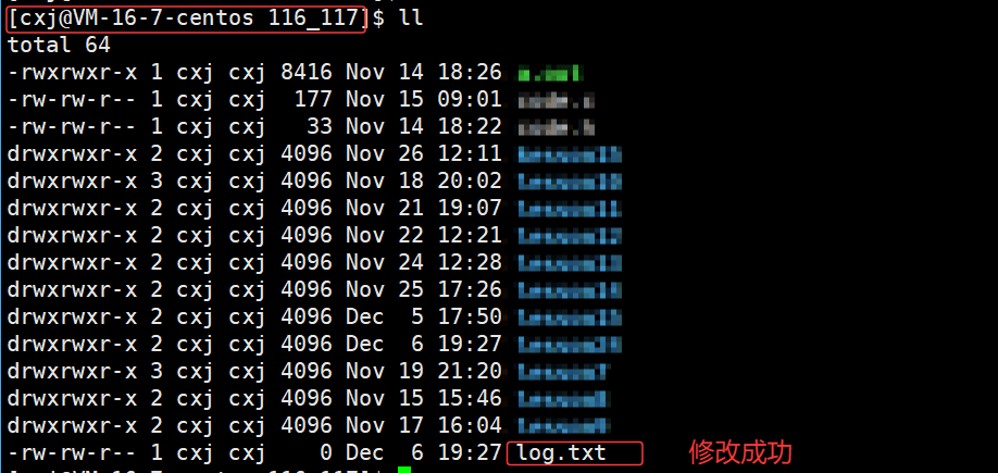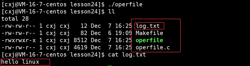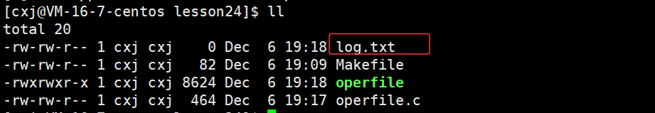 可以看出 /home/cxj/116_117 这个上级路径中已经有了 log.txt 文件,也就说明了若未指定文件绝对路径,系统会自动将进程的cwd与文件名拼接,作为文件创建路径。