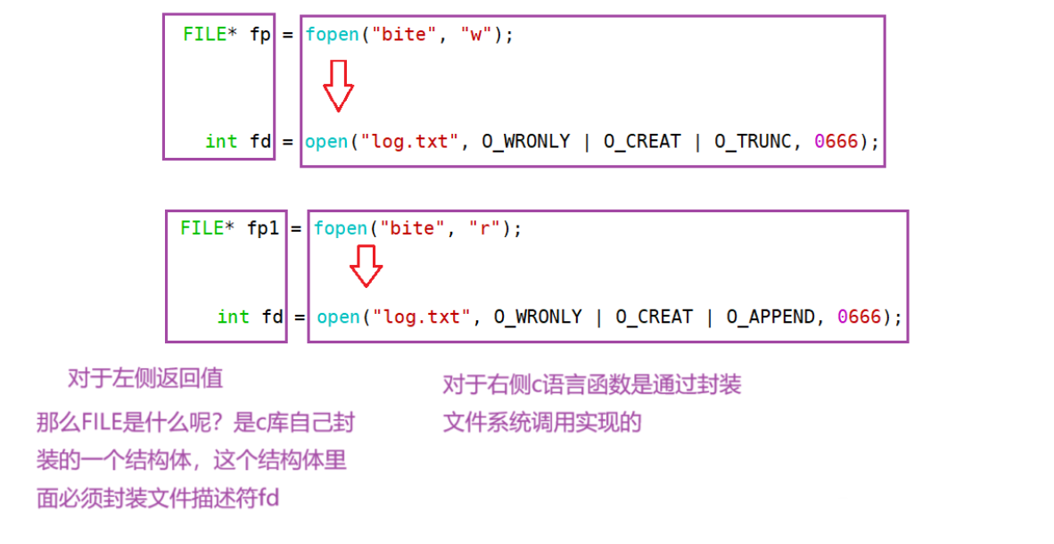 - 作用:fopen/fclose/fread/fwrite 这些C库函数,底层是通过 FILE* 里封装的 fd ,间接调用内核的文件操作接口(比如 open/read/write/close 系统调用),进而操作内核中的 struct file 。