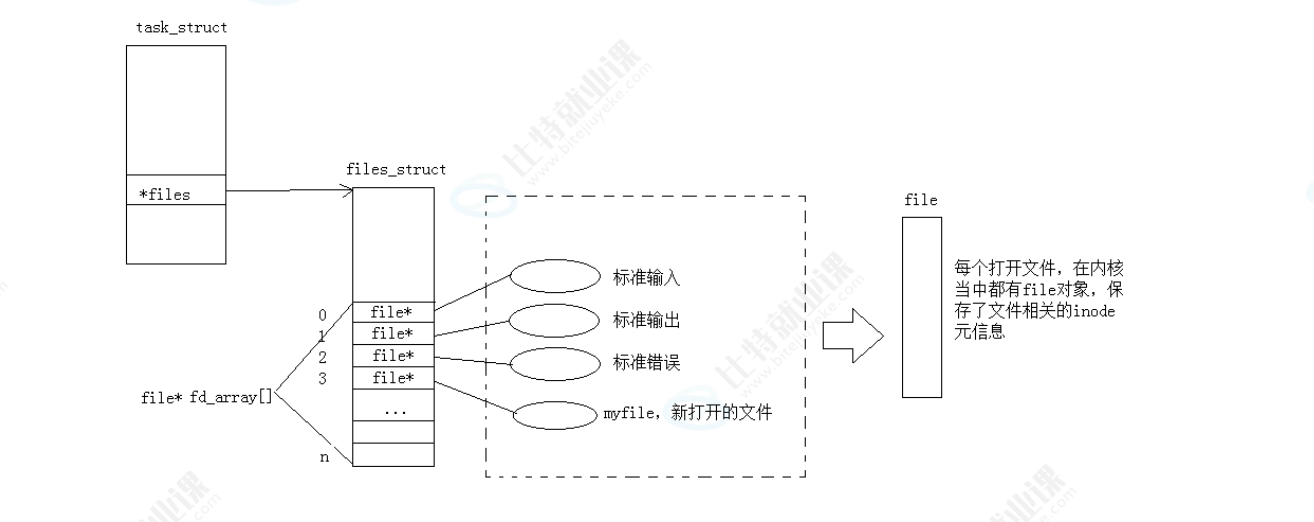 同时在内核中创建一个新的 struct file 对象,用来存储 myfile 的inode元信息(磁盘位置、权限等);