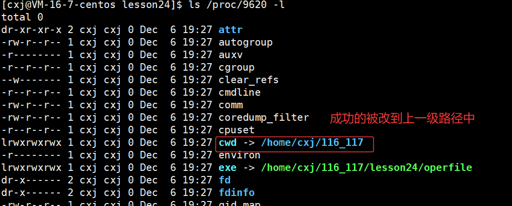 由于我们使用的是普通用户,由于权限的问题,操作系统不会允许,同时我们也不能将这个进程工作目录更改到任意目录,否则会出现问题,但是却可以将进程的工作目录更改到当前普通用户的家目录下即/home/cxj/116_117,因为我普通用户可以将进程的工作路径更改到当前普通用户的家目录的任意路径下,即/home/cxj/116_117这个路径下