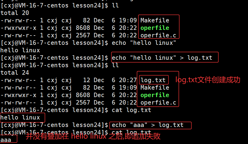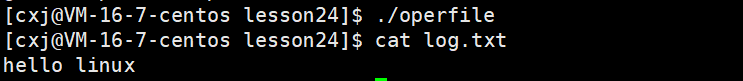 此时已经成功的hello linux写入到log.txt文件中了