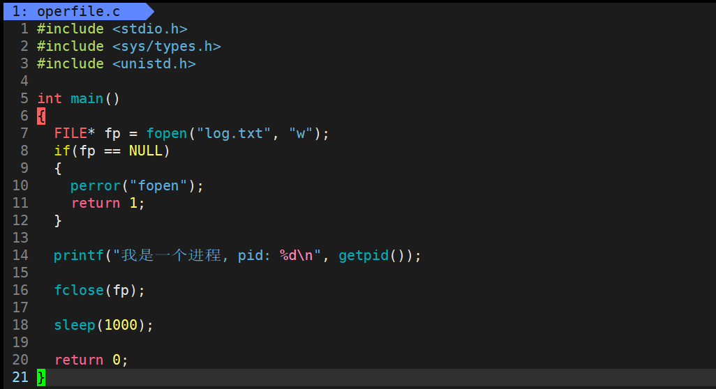 同样的,在上面代码的基础上,打印出当前进程的pid,并且关闭文件之后让进程休眠1000秒,便于我们查看进程的当前工作目录