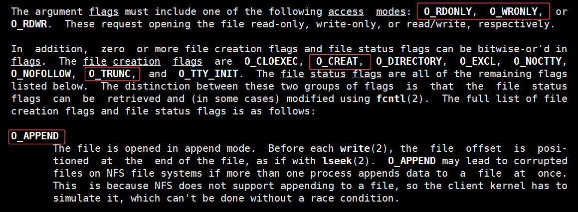 O_RDONLY 是只读,O_WRONLY 是只写 (O_RDONLY 和 O_WRONLY 和O_RDWR可读可写,这三个标志位传入的时候只能传入一个),O_CREA T 是文件不存在则在当前工作路径下创建文件 ,O_TRUNC 是将文件内容截取为0,也就是打开文件后清除文件内容 ,O_APPEND 是打开文件后从文件末尾开始追加式写入