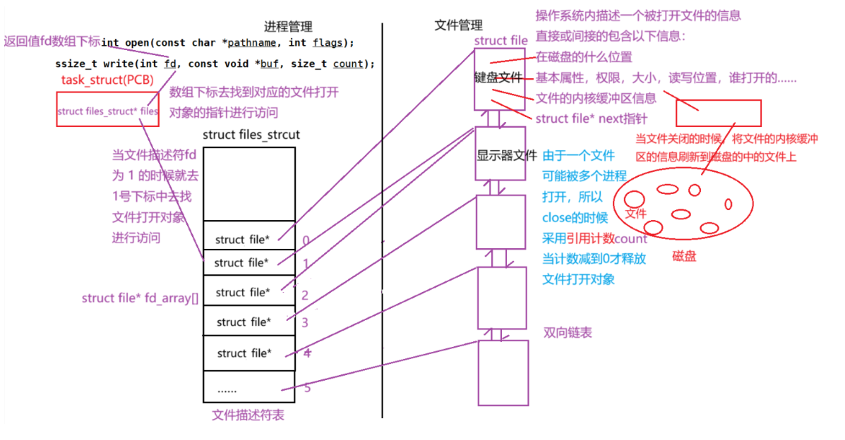 整个流程的核心是:进程通过"文件描述符表的数组下标(fd)",关联到内核中代表文件的 struct file ,最终实现对文件的管理。