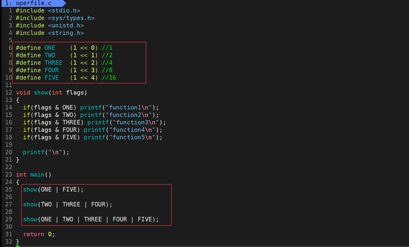 由于open需要使用到比特位方式传递标志位的方式,所以在这里我们先学习一下如何使用比特位方式传递标志位。