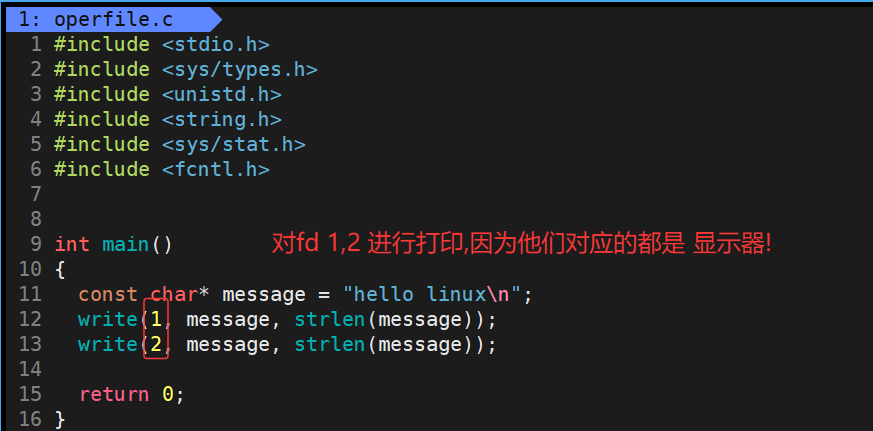 那么我们就可以使用文件系统调用去直接对这些文件描述符0,1,2进行使用,例如使用write直接对文件描述符1,2对应的显示器文件进行打印