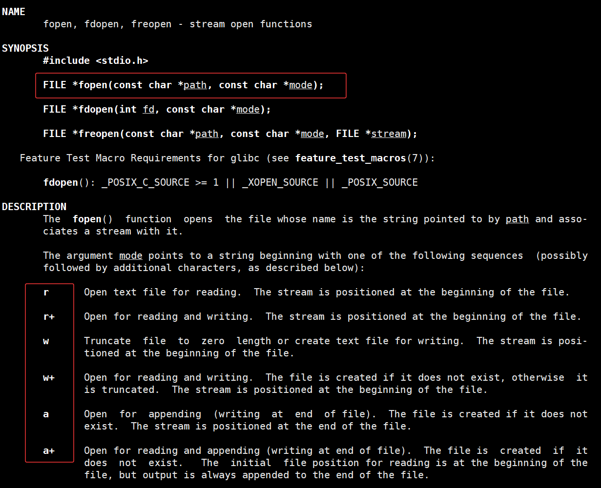 - 返回值:打开成功返回 FILE* 指针 (指向一个记录文件信息的结构体,叫"文件指针/文件句柄");打开失败返回 NULL 。