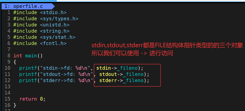 当然这也仅仅是我们的猜测,这三个文件流的的类型是FILE*,我们知道FILE是一个C库定义的一个struct结构体,而这三个文件流的类型就是结构体指针,所以我们可以使用箭头 -> 去访问它的成员,由于FILE这个结构体封装了文件描述符fd,所以我们必然可以使用箭头 -> 去访问到它内部封装的文件描述符fd,其中这个文件描述fd对应的是一个_fileno的成员