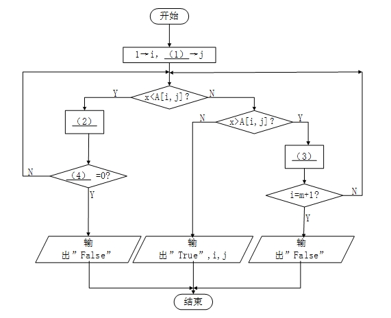 设有二维整数数组(矩阵)A[1:m,1:n],其每行元素从左到右是递增的,每列元素从上到下是递增的。以下流程图旨在该矩阵中需找与给定整数X相等的数。如果找不到则输出"f alse";只要找到一个(可能有多个)就输出"True"以及该元素的下标i和j(注意数组元素的下标从1开始)。