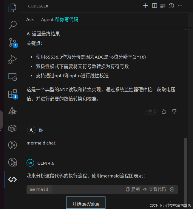 VSCode 安装 CodeGeex 插件,然后鼠标选中分析绘制流程图的源码,输入提示词 "Mermaid绘制流程图",让 CodeGeex AI工具分析源码绘制流程图。
