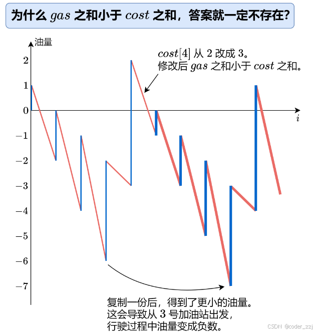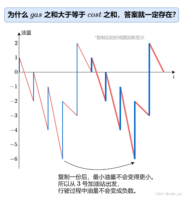 结论:总油量 > 耗油量 时,一定不能走到起点;反之则可以,但关键是要怎么快速找到该位置? 从0位置为起点模拟一遍(画成折线图),最低点则是答案,因为从最低点出发到原点,一定出现不会比最低点还低的情况