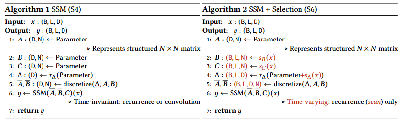 算法1和2展示了我们使用的主要选择机制。主要区别在于,简单地使几个参数A、B、C成为输入的函数,并相应地改变张量形状。具体来说,我们强调这些参数现在具有长度维度L,这意味着模型已经从不变性变为可变性。(注意:形状注释在第2节中进行了描述。)这导致了与卷积(3)等价性的丧失,从而对其效率产生了影响,如下面讨论的那样。