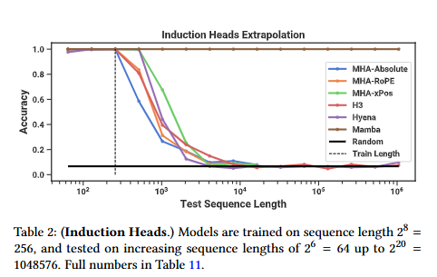 模型。在先前关于诱导头的工作基础上,我们使用了两层模型,这使得注意力能够从机制上解决诱导头的任务(Olsson等人,2022)。我们测试了多头注意力(8个头部,带有各种位置编码)和SSM变体。我们在Mamba中使用了64维的模型维度,在其他模型中使用了128维。