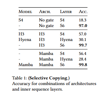表1证实了像H3和Mamba这样的门控架构在性能上只带来了部分改善,而选择机制(修改S4到S6)很容易解决这个任务,特别是当与这些更强大的架构结合使用时。