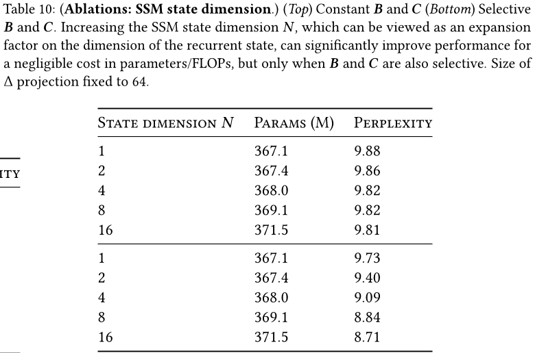 表9和表10分别考虑了A和(B,C)投影的维度变化。从静态到选择性进行更改可以带来最大的好处,而进一步增加维度通常会适度提高性能,并且参数数量的增加很小。