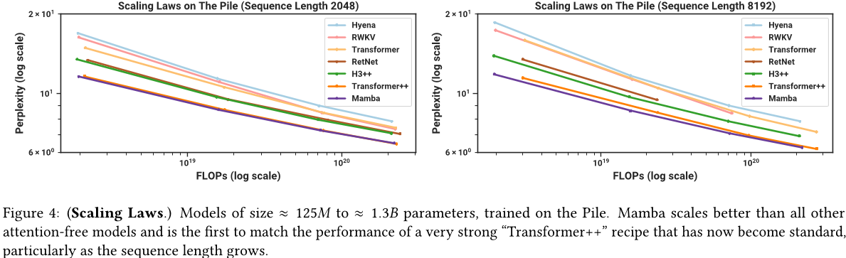 图 4 展示了在标准 Chinchilla(Hoffmann 等,2022 年)协议下,从约 1.25 亿到约 13 亿个参数的模型中的扩展规律。Mamba 是第一个不使用注意力机制的模型,其性能与现在已经成为标准的非常强大的 Transformer 模型(Transformer ++)相匹配,尤其是当序列长度增加时。(需要注意的是,由于缺乏有效的实现导致内存不足或计算需求不切实际,无法获得 RWKV 和 RetNet 基准以及此前的强循环模型(也可视为 SSM)在上下文长度为 8K 的完整结果。)