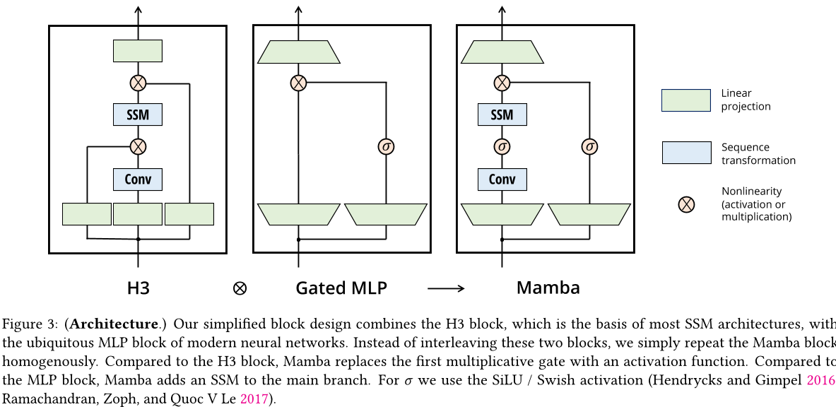 图3:(体系结构)。我们简化了块设计,将大多数SSM体系结构的基础H3块与现代神经网络中无处不在的MLP块相结合。我们没有交错这两个块,而是简单地重复使用Mamba块。与H3块相比,Mamba用激活函数替换了第一个乘法门。与MLP块相比,Mamba在主分支上添加了一个SSM。对于σ,我们使用SiLU/Swish 激活 ( Hendrycks 和 Gimpel 2016 ; Ramachandran 等人 2017 )。