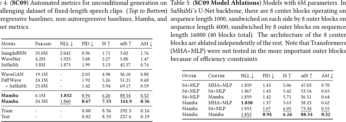 表4:(SC09) 对于一个具有挑战性的固定长度语音片段数据集上的无条件生成的自动度量。(从上到下) 自回归基线,非自回归基线,Mamba 和数据集指标。