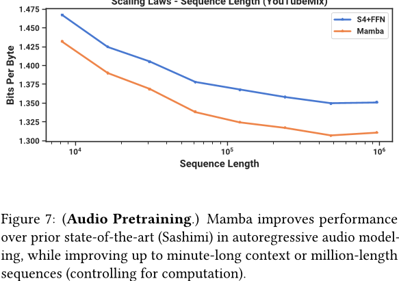 我们在 YouTubeMix(DeepSound 2017)上评估了预训练质量(自回归下一个样本预测),这是一个包含 4 小时独奏钢琴音乐的标准钢琴音乐数据集,采样率为 16kHz。预训练细节遵循标准语言建模设置(见第 4.2 节)。图 7 评估了从 2^13 = 8192 到 2^20 ≈ 106 增加训练序列长度的效果,同时保持计算量不变。(对数据进行编目的方式存在一些细微的边缘情况,可能会导致缩放曲线上的不连续性。例如,只有几分钟长的片段可用,因此最大序列长度实际上受限制为 60s · 16000Hz = 960000 。)