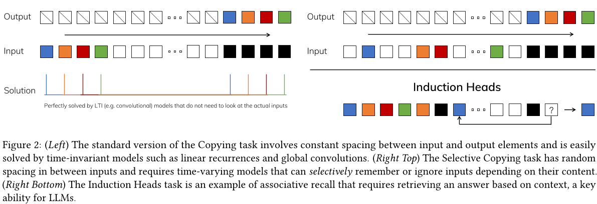 选择性复制任务通过改变要记住的标记的位置来修改流行的复制任务(Arjovsky、Shah 和 Bengio 2016)。它需要内容感知推理,以便能够记住相关的标记(彩色)并过滤掉不相关的标记(白色)。
