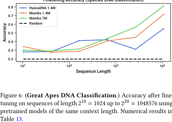 图6:大猩猩DNA分类。(使用具有相同上下文长度的预训练模型,在序列长度为210 = 1024到220 = 1,048,576之间进行微调)。表13中的数字结果。