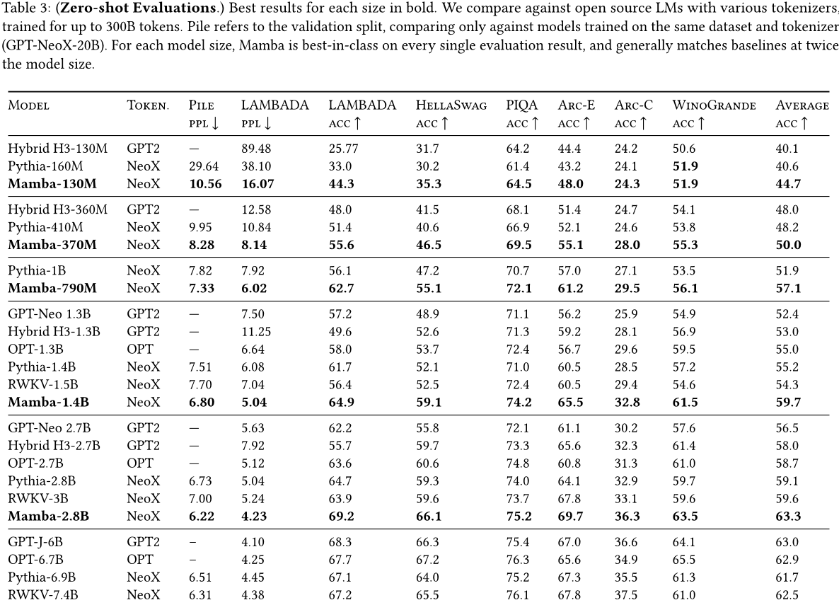 表3显示了Mamba在一系列流行的下游零样本评估任务中的性能。我们与这些规模上最知名的开源模型进行了比较,最重要的是Pythia(Biderman等人,2023年)和RWKV(Peng等人,2023年),它们使用与我们的模型相同的分词器、数据集和训练长度(300B个标记)。注意,Mamba和Pythia使用上下文长度为2048进行训练,而RWKV使用上下文长度为1024进行训练。