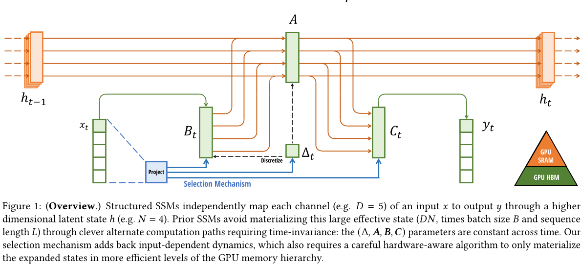 硬件友好的基本元素,如卷积( Krizhevsky、Sutskever 和 Hinton,2012 年)和注意力( Bahdanau、Cho 和 Bengio,2015 年; Vaswani 等人,2017 年),得到了广泛的应用。在这里,我们的目标是在现代硬件(GPU)上高效地实现选择性 SSM。这种选择机制非常自然,早期的工作试图纳入选择的一些特殊情况,例如在递归 SSM 中让 A 随时间变化(Gu、Dao 等人,2020 年)。但是,正如前面提到的,SSM 的使用存在一个关键限制,即它们的计算效率低下,这就是为什么 S4 及其所有变体都使用了线性时不变 (LTI) 模型,最常见的是全局卷积的形式。