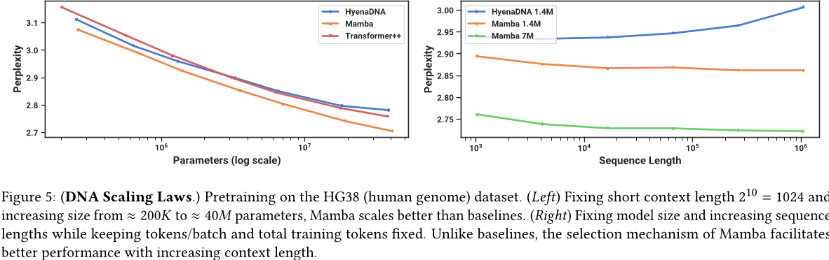 结果。图 5 (右) 表明,蟒蛇能够利用更长的上下文,甚至可以处理长度为 1M 的非常长的序列,其预训练困惑度随着上下文的增加而提高。另一方面,HyenaDNA 模型在序列长度方面表现不佳。这可以从第 3.5 节关于选择机制属性的讨论中直观地看出。特别是,LTI 模型不能选择性地忽略信息;从卷积的角度来看,一个非常长的卷积核正在聚合整个长序列中的所有信息,这可能非常嘈杂。需要注意的是,虽然 HyenaDNA 声称其在较长的上下文环境中表现更好,但他们的实验没有控制计算时间。