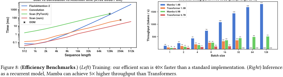 图8:(效率基准。左)训练:我们的高效扫描比标准实现快40倍。(右)推理:作为一个递归模型,Mamba 的吞吐量比 Transformer 高5倍。