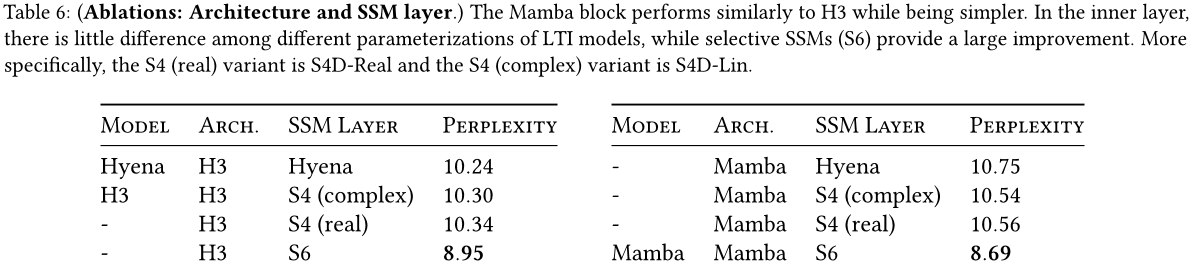 • Mamba 架构与 H3 架构表现相似(使用选择性层时,似乎略好)。