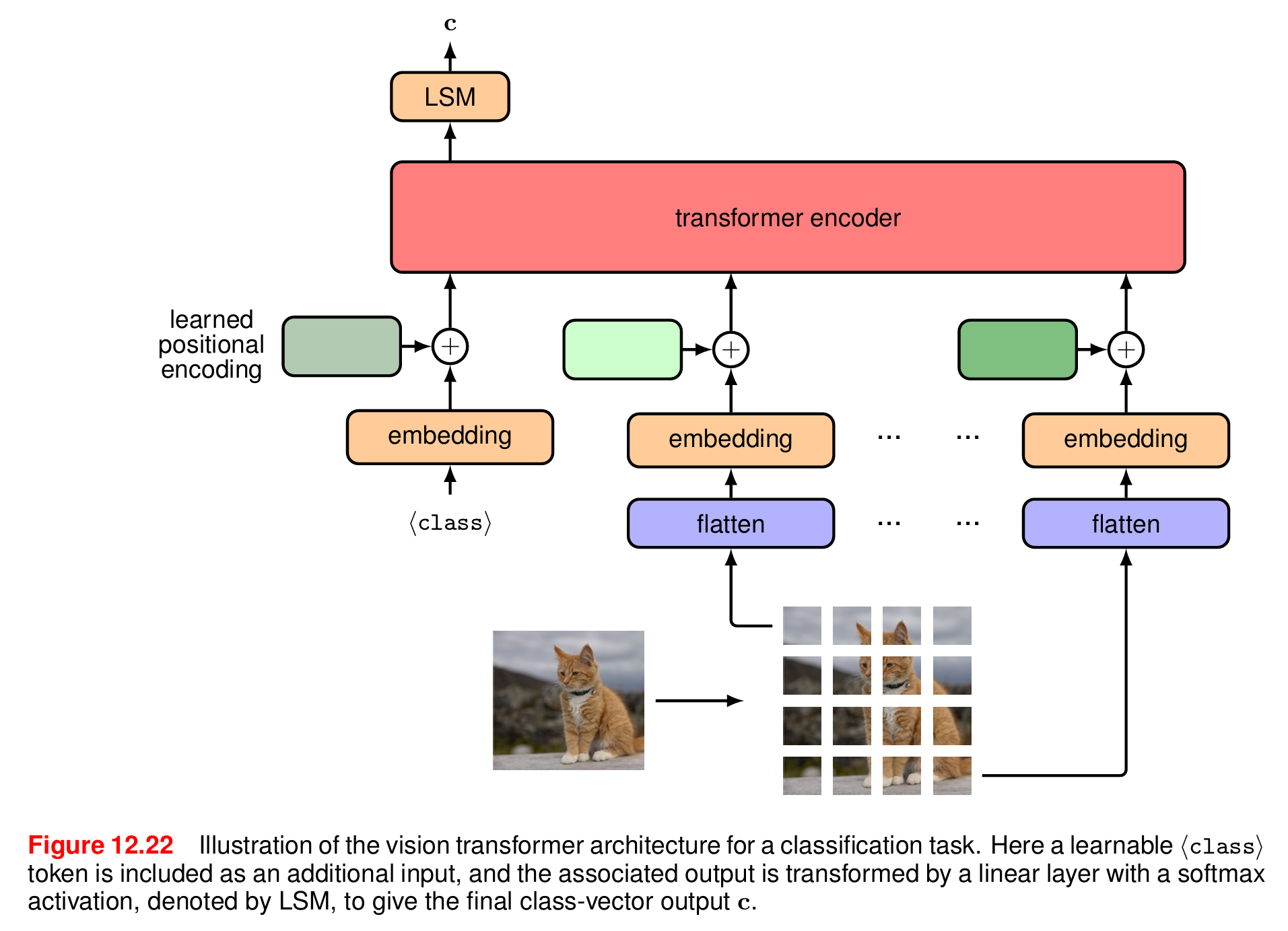 最常见的分词方法是将图像分割成一组大小相同的小块,然后通过线性变换映射为 token。假设图像的尺寸为 x ∈ R H × W × C \boldsymbol{x} \in \mathbb{R}^{H \times W \times C} x∈RH×W×C,其中 H H H和 W W W分别指的是图像的高度和宽度(以像素为单位), C C C是通道数(R、G、B 三种颜色的通道数通常为 3)。每幅图像被分割成大小为 P × P P \times P P×P的非重叠小块( P = 16 P = 16 P=16是常见的选择),然后"平铺"成一维向量,这样就得到了图像尺寸的另一种表示 x p ∈ R N × ( P 2 C ) \boldsymbol{x}_p \in \mathbb{R}^{N \times (P^2C)} xp∈RN×(P2C),其中 N = H W / P 2 N = HW / P^2 N=HW/P2是一幅图像的小块总数。用于分类任务的视觉 Transformer 的架构如图所示。