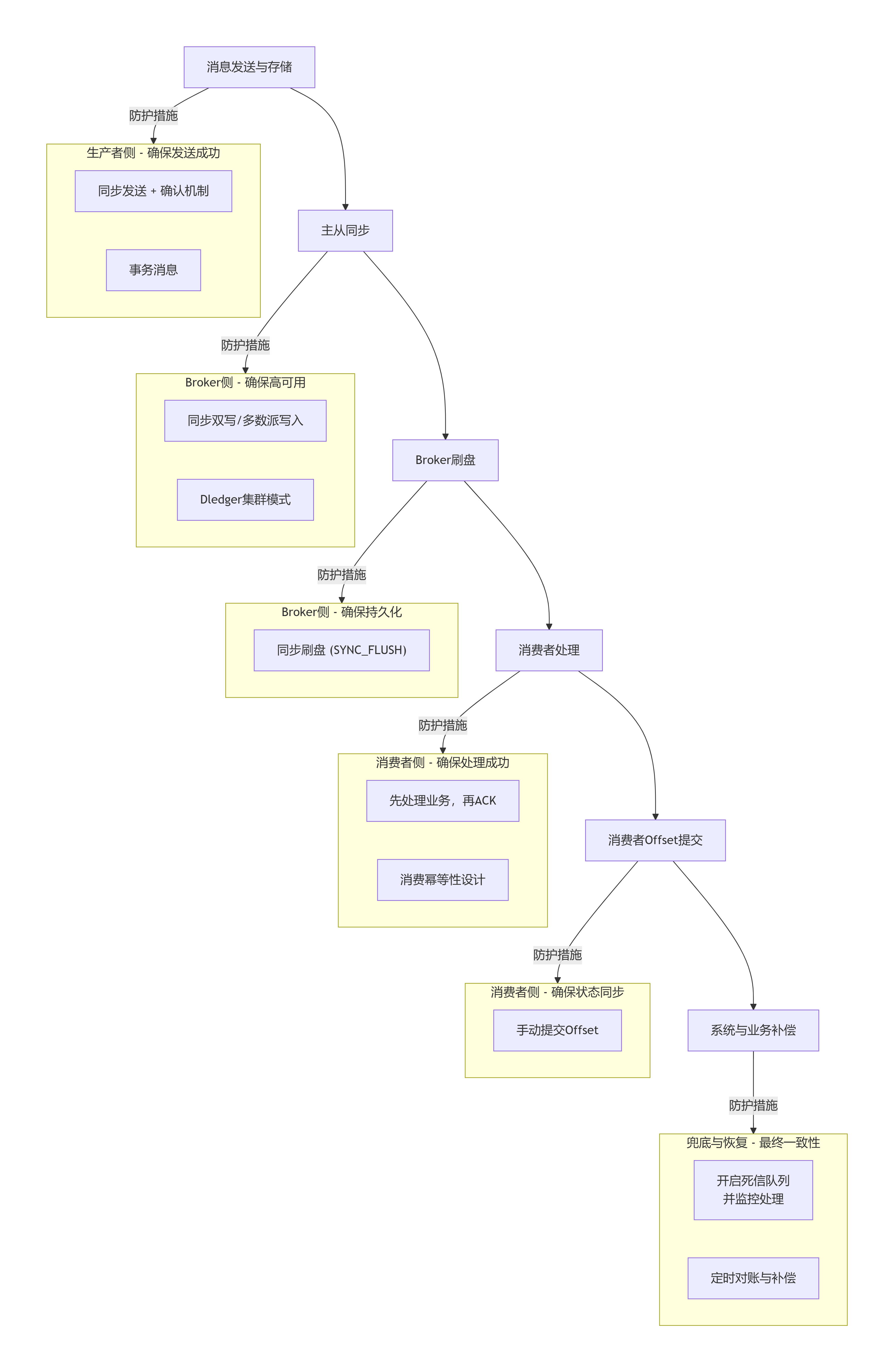 下图清晰地展示了消息从生产到消费的全链路中,六个可能丢失的关键环节及其应对策略的逻辑关系,帮助你建立整体视图: