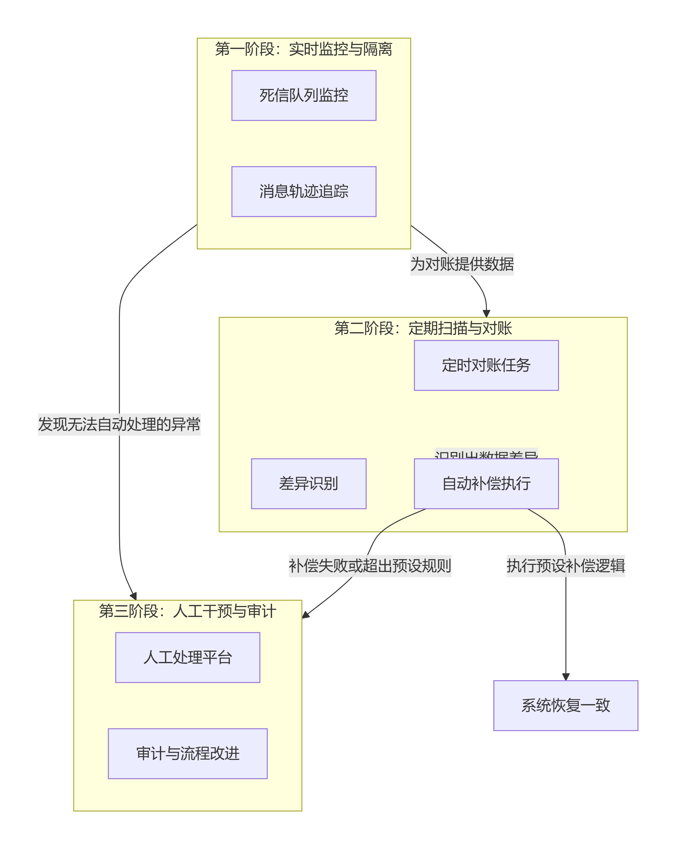 定时对账与补偿作业 :这是保证最终一致性的终极手段。根据业务周期(如每天凌晨),扫描业务数据和消息流水,对状态不一致的数据进行修补或人工干预。