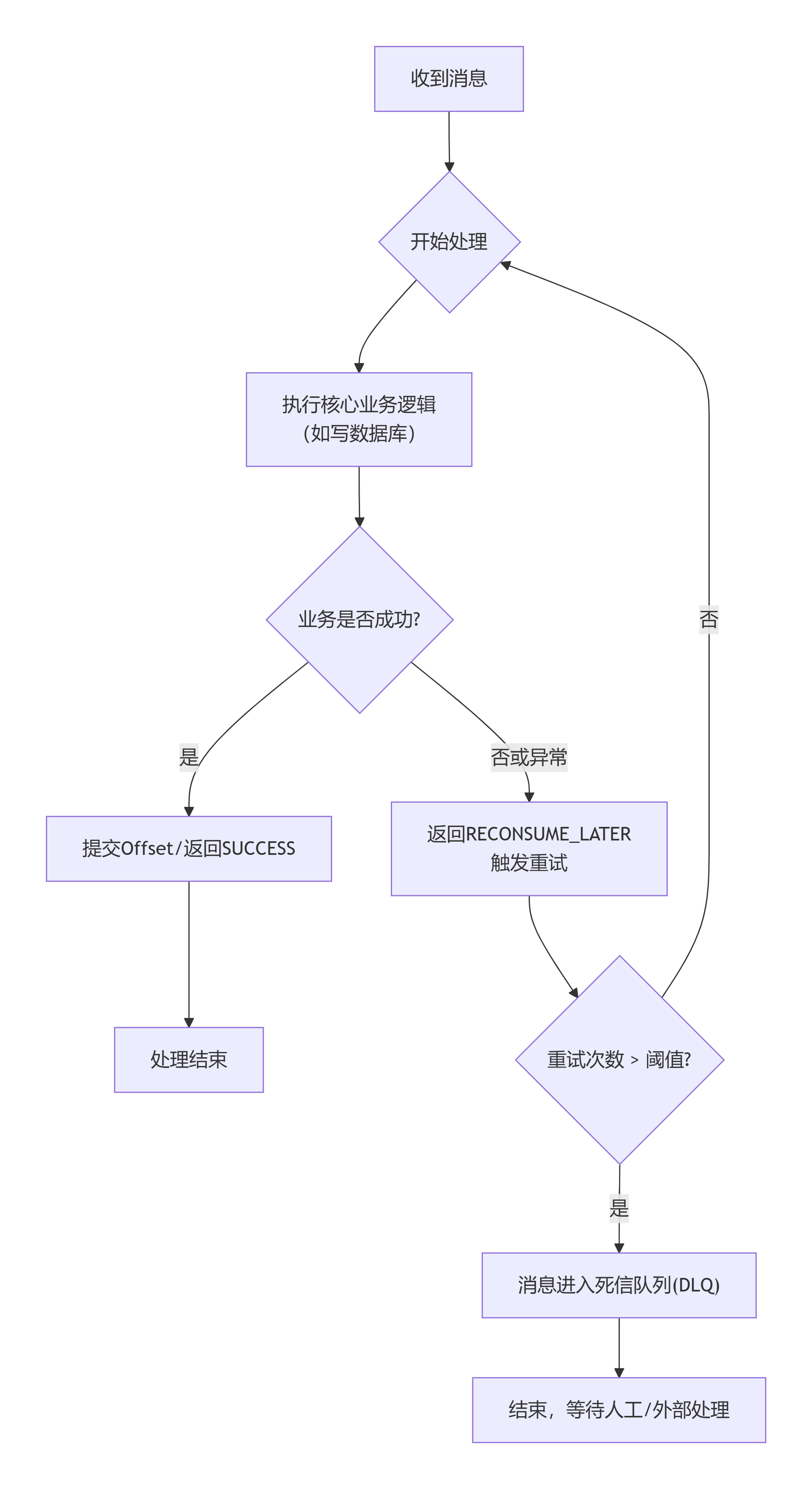 消费者阶段是消息不丢失的最后一道防线,也是实现业务一致性的关键 。这个阶段的可靠性不依赖单一配置,而需要一套从处理流程、状态管理到容错设计的完整方案。