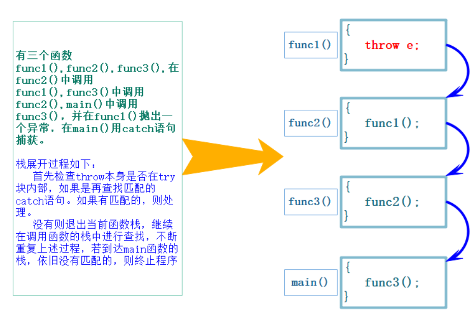 栈展开(Stack Unwinding) :当异常被抛出后,程序控制流会沿着调用栈向上回溯,直到找到匹配的