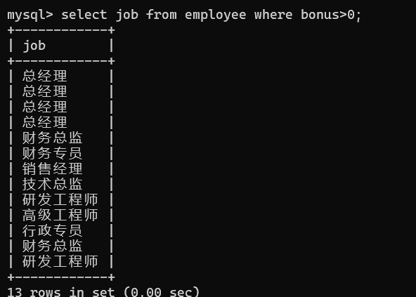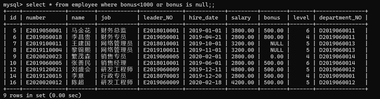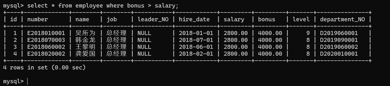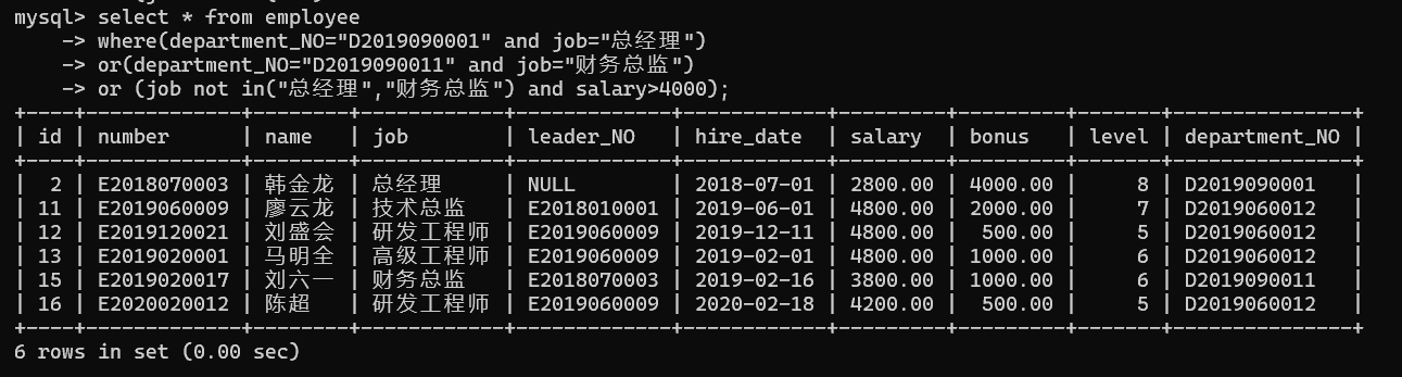 - 找出部门编号为D2019090001中所有总经理,部门编号为D2019090011中所有财务总监,还有即不是总经理又不是销售总监但其工资大或等于4000的所有员工详细资料。