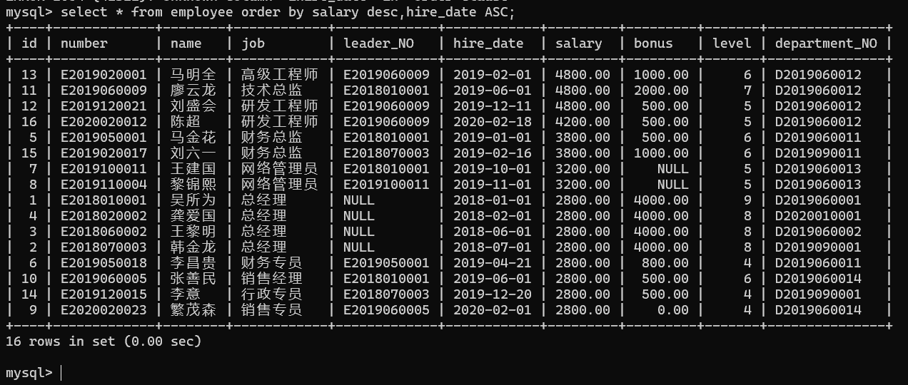 12. 查询所有员工详细信息,用工资降序排序,如果工资相同使用入职日期升序排序。