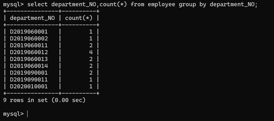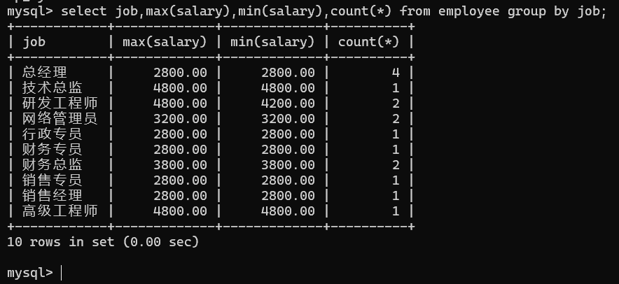 select job,max(salary),min(salary),count(*) from employee group by job;