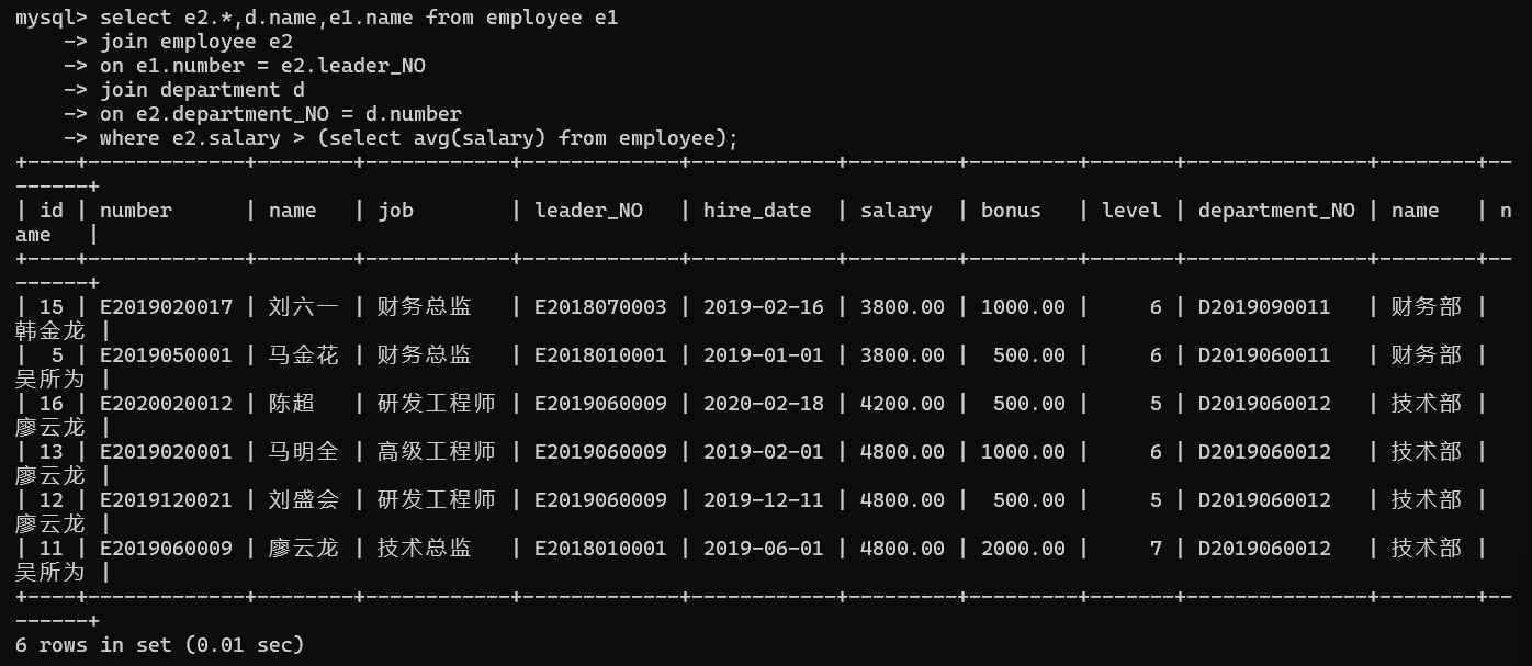 5. 列出薪金高于公司平均薪金的所有员工信息,所在部门名称,上级领导。