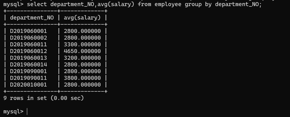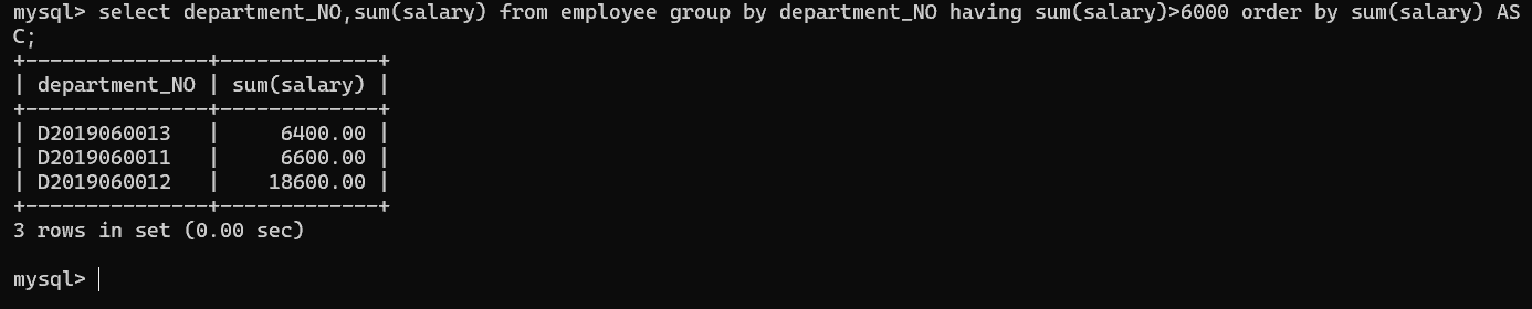 select department_NO,sum(salary) from employee group by department_NO having sum(salary)>6000 order by sum(salary) ASC;