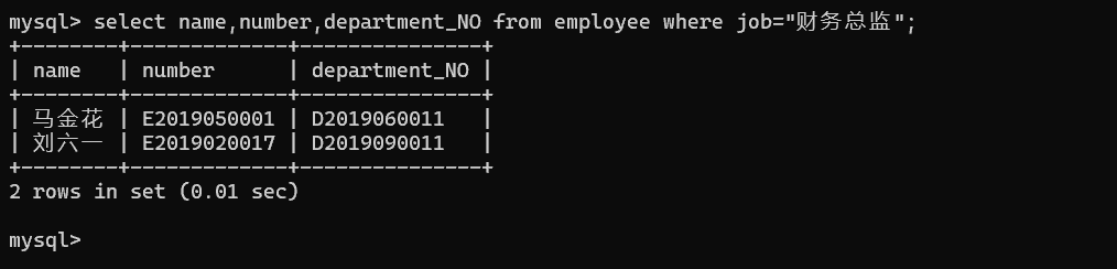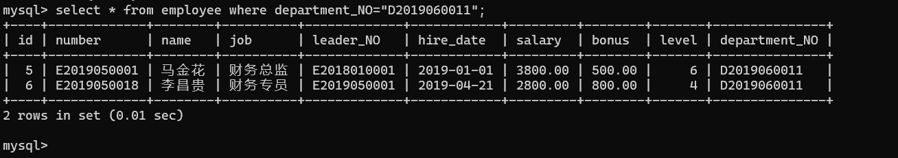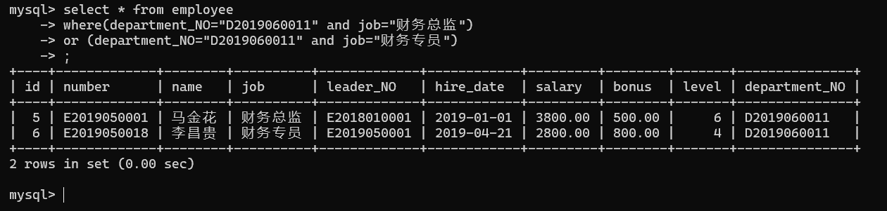 5 找出部门编号为D2019090011中所有财务总监,和部门编号为D2019060011中所有财务专员的详细资料。