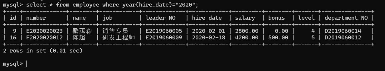 (9, 'E2020020023', '繁茂森', '销售专员', 'E2019060005', '2020-02-01', 2800.00, 0.00, 4, 'D2019060014'),
