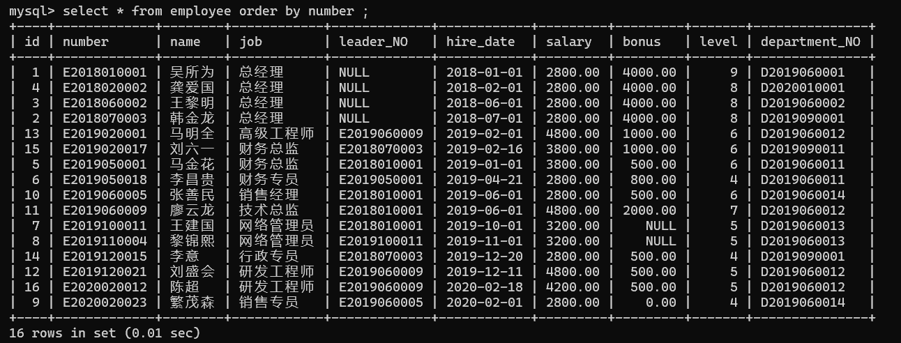 (10, 'E2019060005', '张善民', '销售经理', 'E2018010001', '2019-06-01', 2800.00, 500.00, 6, 'D2019060014'),