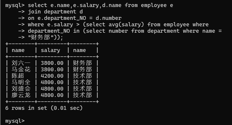 8. 列出薪金高于在财务部工作员工平均薪金的员工姓名和薪金、部门名称。