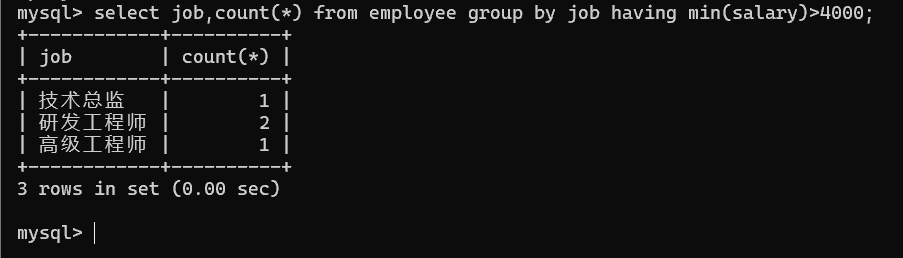 16. 列出最低薪金大于4000的各种工作及从事此工作的员工人数。